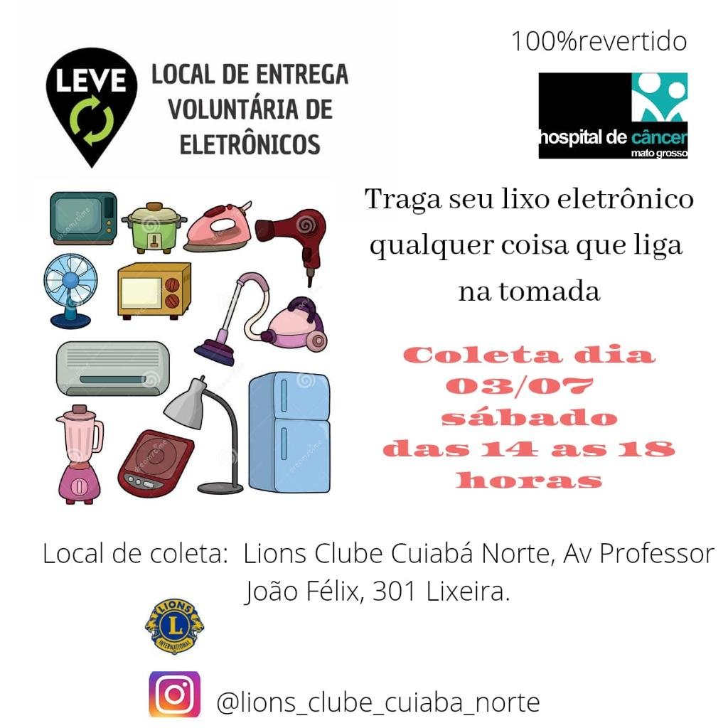 Acontece neste sábado, dia 03, das 14h às 18h, no bairro Lixeira, em Cuiabá, a coleta de materiais eletrônicos pelo Lions Clube Cuiabá Norte.