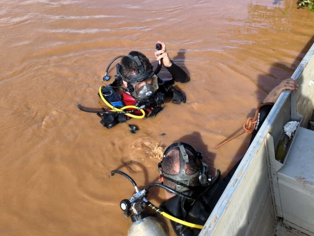 Mergulhadores iniciaram as buscas ainda na segunda-feira, mas as condições do rio dificultaram a operação devido ao nível elevado da água, à forte correnteza e à grande quantidade de detritos.