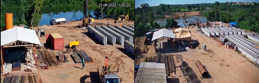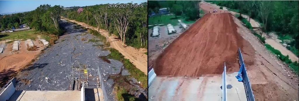 Por fim, há uma câmera na nova ponte sobre o Rio Cuiabá, no bairro Parque Atalaia. No final de junho a foto mostra a pista ainda com as pedras utilizadas para dar estabilidade e ajudar na drenagem do terreno. Agora, o aterro já está na altura da ponte.