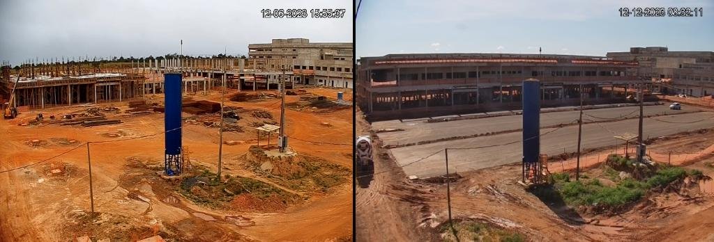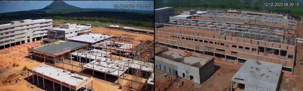 Ainda em maio, o bloco principal do hospital estava no começo, com a construção da laje do primeiro andar. Agora, são três pavimentos erguidos e serviços de alvenaria avançados.