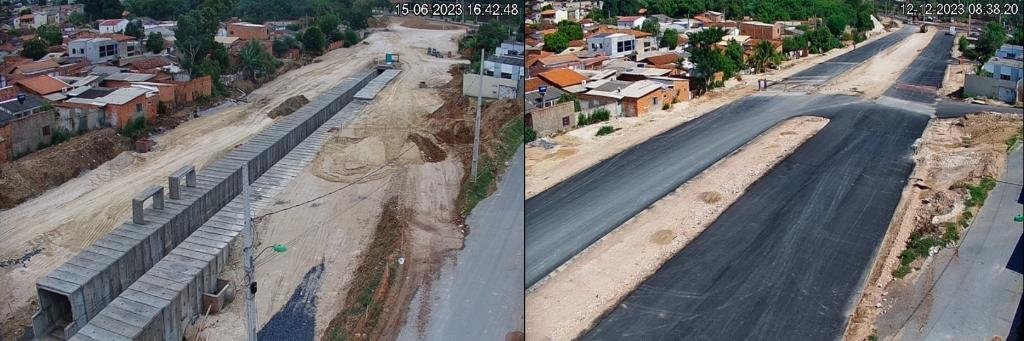O primeiro registro mostrava ainda o trabalho de concretagem das galerias de água do Córrego do Barbado. Agora, o cenário é do córrego fechado e as pistas asfaltadas.