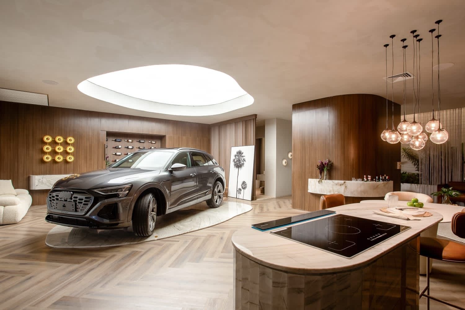 A marca Audi se faz sentir através do Audi Q8, que não é apenas um elemento de design, mas o ponto central do projeto. O conceito de movimento, incorporado pelo carro, reflete a ideia de “migrar”, onde caminhos e novas escolhas levam as pessoas de um lado para o outro. A iluminação em lona tensionada, com formas amorfas, representa o movimento e os caminhos que o casal percorreu e servem como palco para o veículo. Estrategicamente posicionado no ponto focal do projeto, o carro se destaca dos dois ângulos das portas de entrada e saída, capturando a atenção dos visitantes.