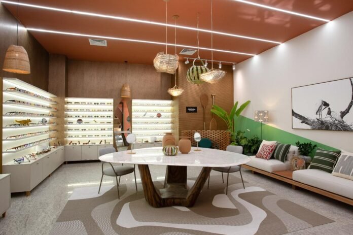 A brasilidade ganha destaque na leitura delicada e sofisticada do espaço, onde óculos exclusivos, pintados à mão, se tornam peças de arte. O ambiente é marcado pela presença de materiais naturais, pela representação da arte popular mato-grossense e pela estética única do design brasileiro.