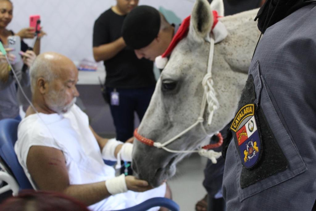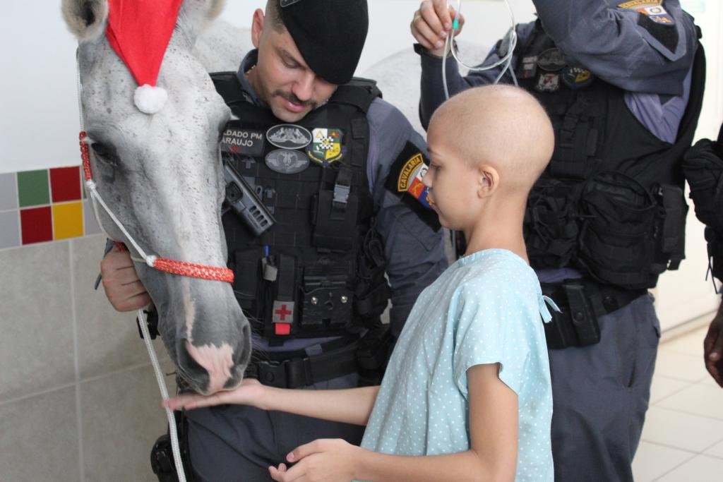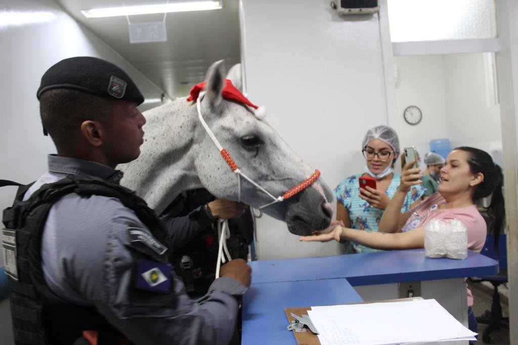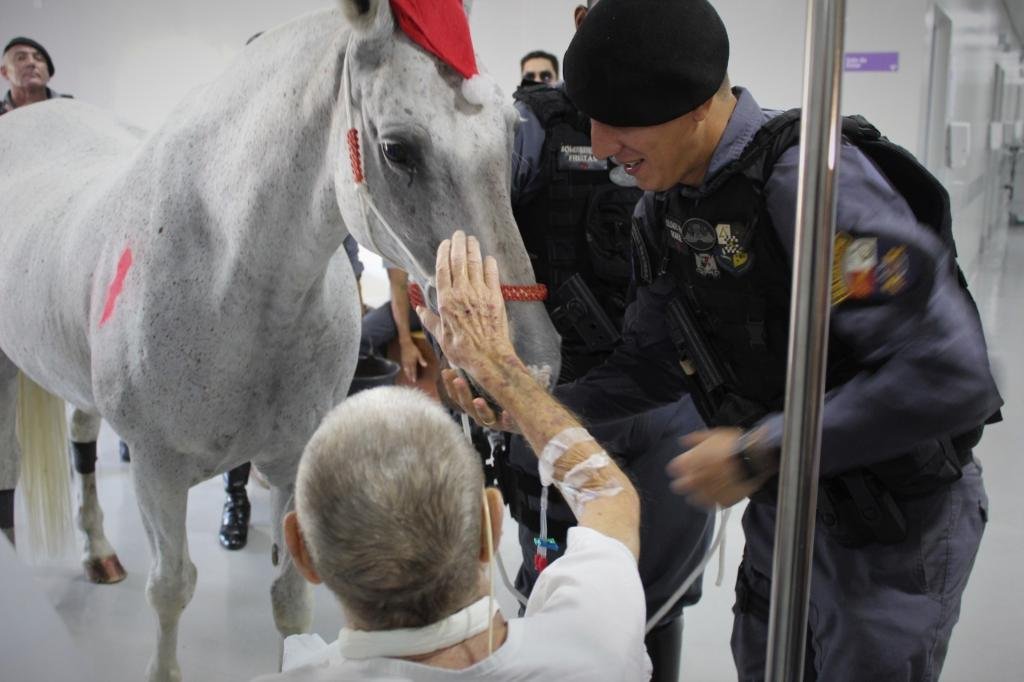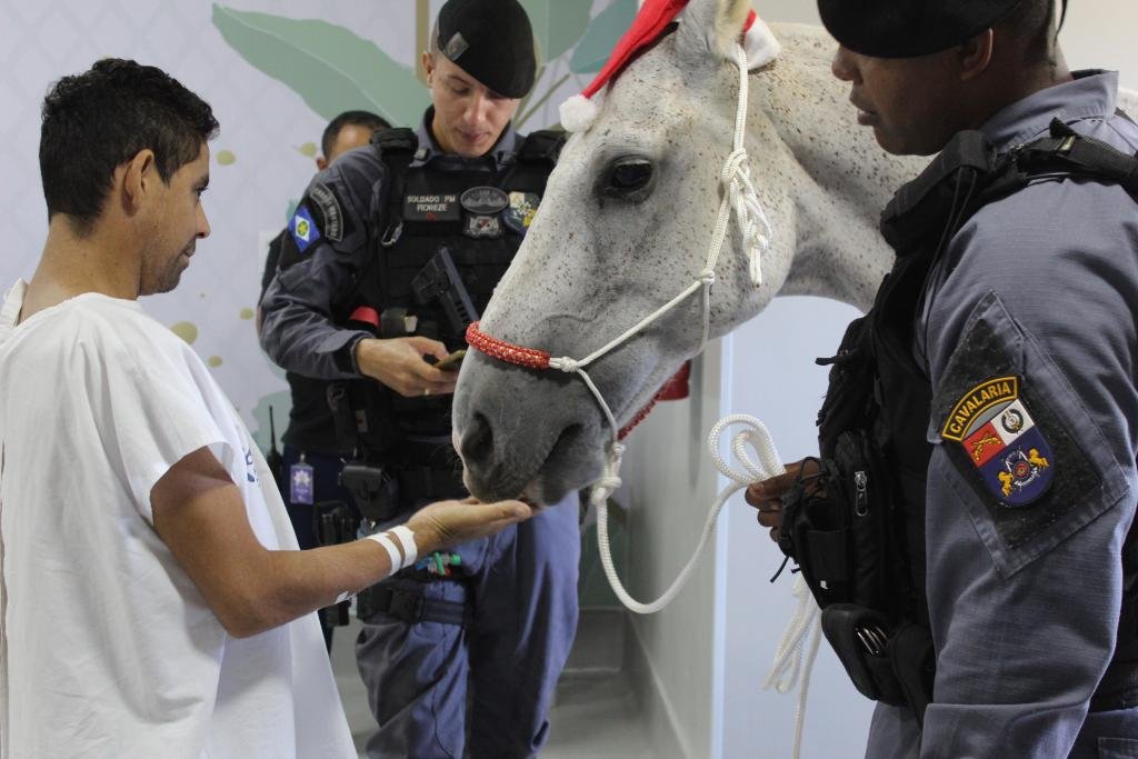 O cavalo Atack, um dos animais da unidade especializada da PM, percorreu os corredores das alas pediátricas e clínicas do hospital caracterizado com um gorro de Natal e desenhos de corações espalhados pelo corpo, chamando atenção de adultos e crianças.