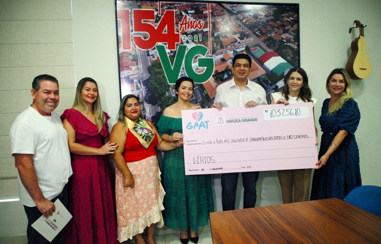 O prefeito de Várzea Grande Kalil Baracat e a primeira-dama e idealizadora do Gabinete de Apoio às Ações Transformadoras (GAAT), promotora de Justiça, Kika Dorilêo Baracat, entregaram para a diretora executiva da Lírios – Liga de Reestruturação das Irmãs Ofendidas no Seu Sentimento, Maria Fernanda Figueiredo, um cheque simbólico no valor de R$ 103.256,10 relativo à arrecadação da Segunda Edição do Bazar do Bem, realizado nos dias 30 de novembro e 1º de dezembro, com a venda de mais de 6 mil peças de roupas, calçados e acessórios. A solenidade de entrega ocorreu no gabinete do Executivo municipal.