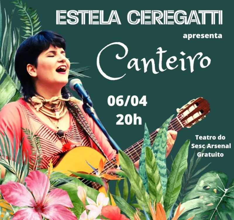 A musicista Estela Ceregatti apresenta hoje (6), no teatro do Sesc Arsenal, em Cuiabá, o show Canteiro. A apresentação começa às 20h e conta com o instrumental de Jhon Stuart, Yndira Villaroel e Alaécio Martins, além da participação especial de Vera Capilé. A entrada é gratuita.