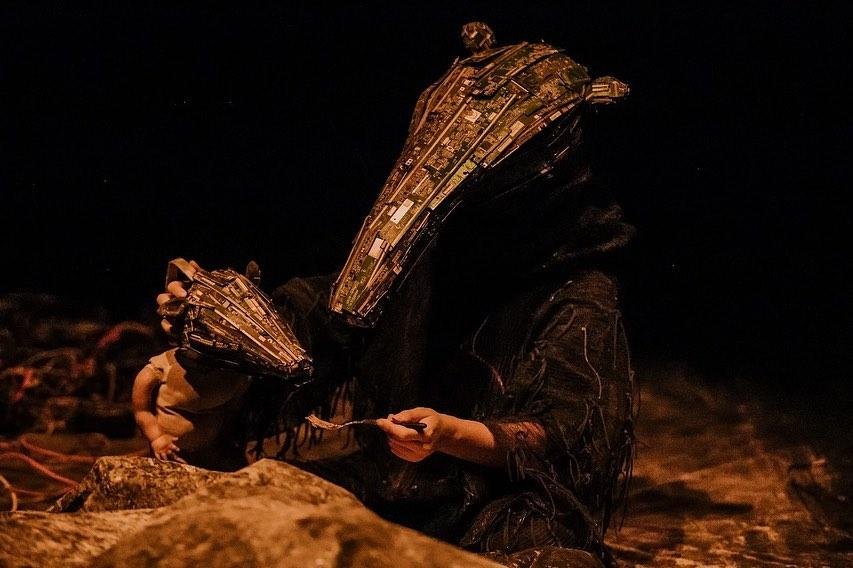 Para desenvolver cenas que simbolizam elementos culturais e ambientais da Amazônia brasileira, como animais, personagens folclóricos, questões relacionadas à mineração e tecnologia, o Coletivo utiliza materiais eletrônicos residuais que são transformados em máscaras e fantoches.