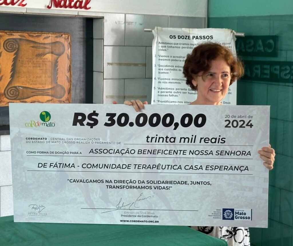 A Associação Beneficente N. Srª de Fátima – Comunidade Terapêutica Casa Esperança de Rondonópolis recebeu R$ 30 mil para manter o acolhimento, tratamento e reinserção social de pessoas em situação de rua e com dependência química. A doação da Cordemato – Central das Organizações do Estado de Mato Grosso -, realizada neste sábado (20.04) na sede da Casa, é uma das metas do Leilão do Leilão Haras Retiro Velho e Amigos de Mato Grosso, realizado neste mês em Cuiabá.