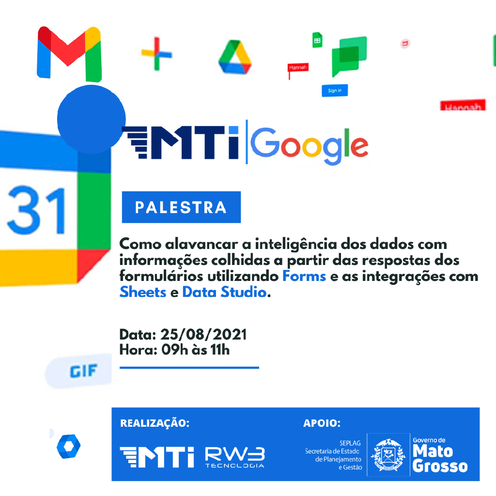 A Empresa Mato-grossense de Tecnologia da Informação (MTI) promove, no próximo dia 25 de agosto, a terceira edição do #GOOGLEDAY, treinamento online sobre as principais ferramentas do MTI Google Workspace eCrypto. O evento online, aberto a todos os usuários do Google Workspace será realizado entre às 9h 11h. As inscrições se encerram no dia 24 de agosto.