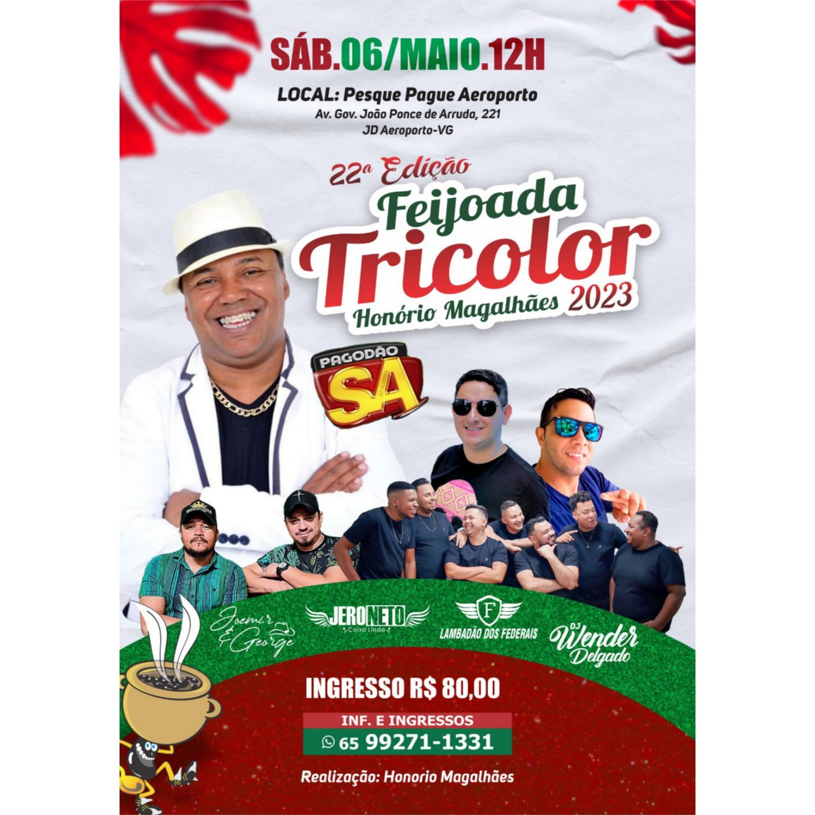 A já tradicional Feijoada Tricolor de Honório Magalhães será realizada em um novo local em 2023. O evento acontecerá no dia 06 de maio, no Pesque Pague Aeroporto, localizado na Avenida Governador João Ponce de Arruda, próximo ao Aeroporto Marechal Rondon. A Feijoada é uma festa voltada à valorização da cultura do município, regada a boa comida, bebida e excelentes atrações.