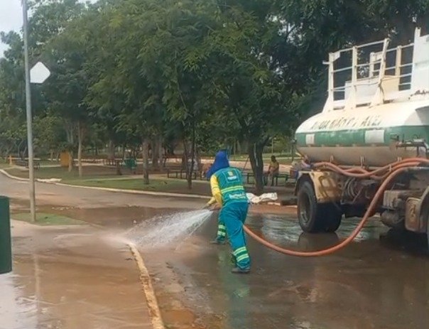 No Parque das Águas, foi realizada limpeza completa com auxílio de caminhões-pipa e remoção de galhos derrubados pela chuva. Equipes de iluminação pública também atuaram emergencialmente em pontos onde a rede foi afetada.