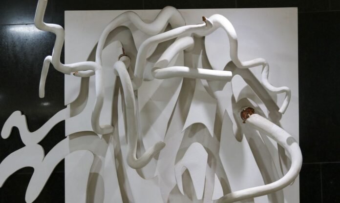 – Escultura de parede em madeira de Frans Krajcberg — quebrada em diversos pontos. A obra se utiliza de galhos de madeira, que foram quebrados e jogados longe. A peça era estimada em R$ 300 mil.