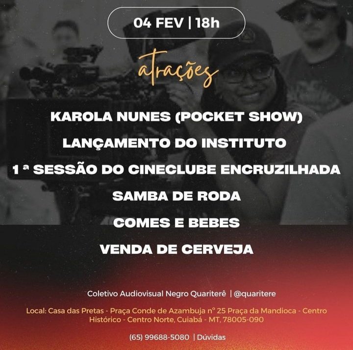 A Comemoração será em grande estilo e totalmente gratuita: contando com apresentações musicais como, @karola_nunes (pocket show) e Samba de Roda, além da realização da primeira Sessão do Cineclube Encruzilhada (idealização do Coletivo Quariterê), na qual serão exibidos 3 curtas, além de comes e venda de cerveja para os presentes.