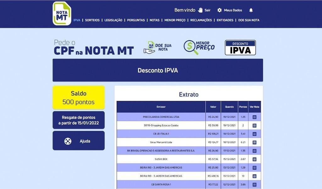 A pontuação para ter o desconto no IPVA é acumulada a partir do valor dos documentos fiscais, seja nota fiscal ou bilhete de passagem eletrônico. Geram pontos todos os documentos emitidos a partir do 1º dia do ano em que tenha sido efetivada a inscrição no programa Nota MT, desde que o CPF seja informado na nota.