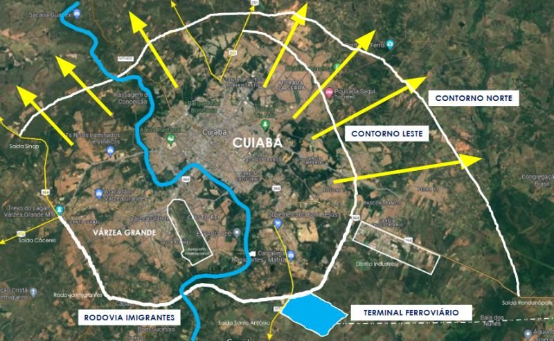O terminal previsto na minuta do novo plano diretor, mesmo local apontado pela Rumo S.A., ficará em uma posição estratégica, entre o Distrito Industrial e a Rodovia dos Imigrantes, na saída para Santo Antônio de Leverger, em Cuiabá.