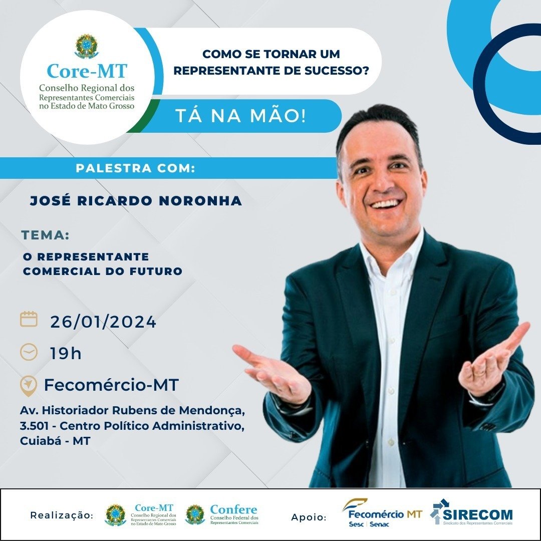Em um cenário dinâmico de negócios, a cidade de Cuiabá receberá a palestra inspiradora “O Representante Comercial do Futuro”, ministrada por José Ricardo Noronha, conferencista renomado e CEO da Paixão por Vendas, uma das consultorias mais conceituadas do Brasil. O evento, promovido pelo Core-MT e Conselho Federal dos Representantes Comerciais (Confere), acontecerá no dia 26 de janeiro, na Fecomércio-MT.