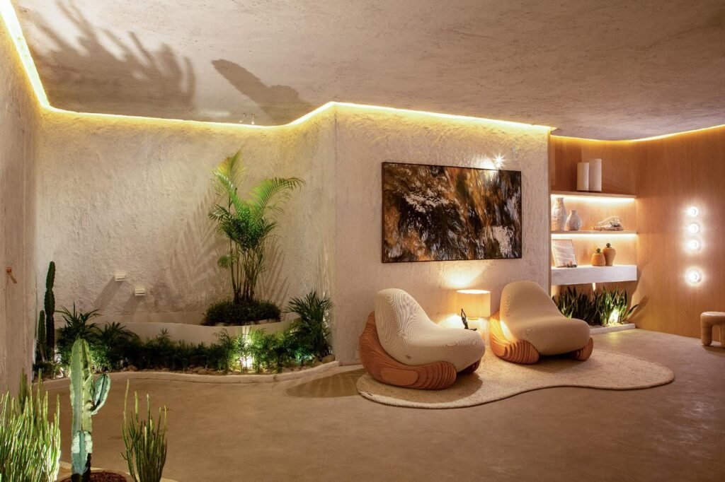 Parcerias estratégicas são a base deste projeto, e a coleção Amara, de Casa Bellarte, junto com os revestimentos de argila, cria uma harmonia entre o minimalismo presente no ambiente e a natureza, reforçando a busca pela conexão entre artesanato e bem-estar.