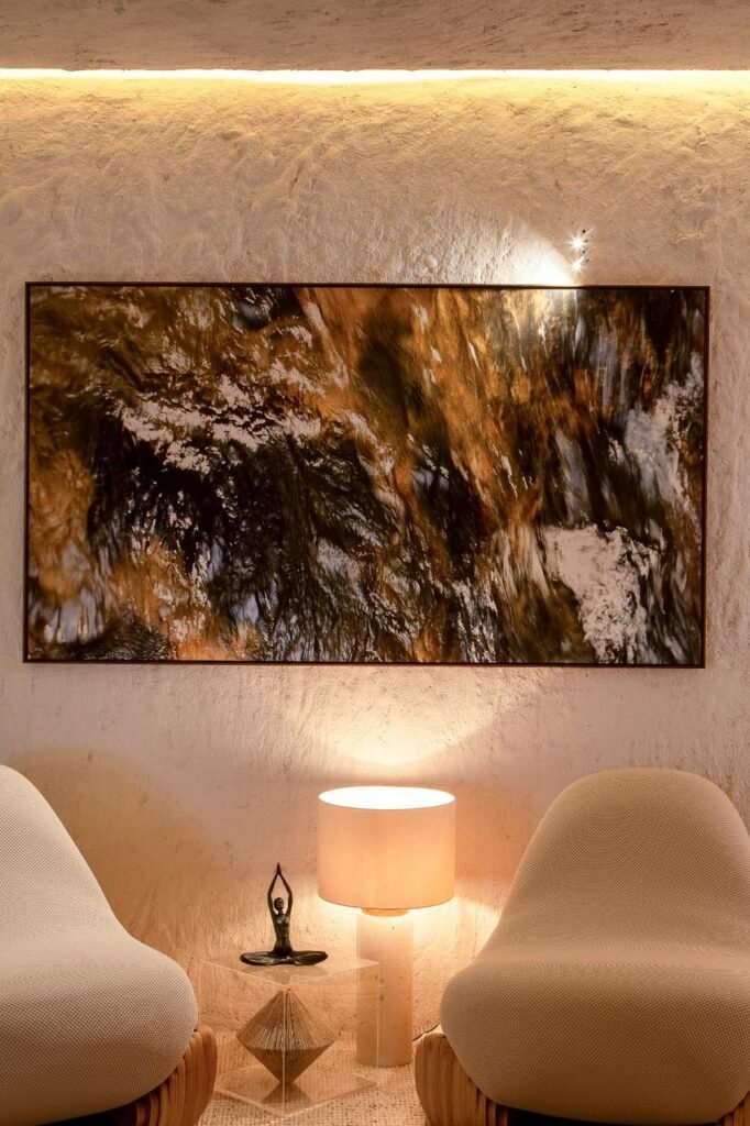 Além das técnicas de Feng Shui que permeiam a experiência, a atenção aos detalhes é evidente nos revestimentos feitos de argila pela Geórgia Filipovich e da Eco Decor, proporcionando não apenas uma estética refinada, mas também um toque orgânico que se alinha com a proposta de cura prânica.