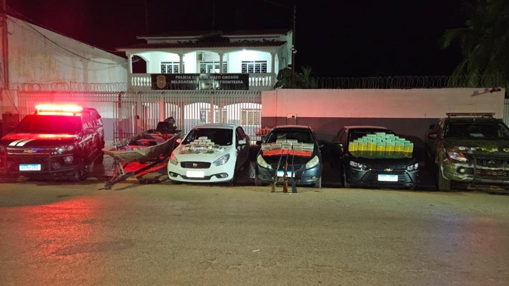 As forças de segurança apreenderam, na noite de terça-feira (21), 103 quilos de entorpecentes, três veículos, três espingardas e uma embarcação na região de fronteira em Cáceres (a 220 km de Cuiabá). As apreensões, resultado das operações Protetor das Divisas e Fronteiras e Tolerância Zero, representam um prejuízo estimado de R$ 1,5 milhão às facções criminosas.