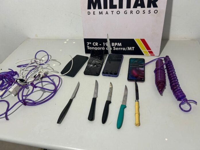 Policiais militares do 19º Batalhão resgataram, na noite desta segunda-feira (8), quatro pessoas mantidas reféns e apreenderam quatro adolescentes envolvidos em sequestro e cárcere privado, em Tangará da Serra (252 km de Cuiabá). Na ação, foram apreendidos três facas, além de dois rolos de fios elétricos e de cadeiras, usados para amarrar e intimidar as vítimas.