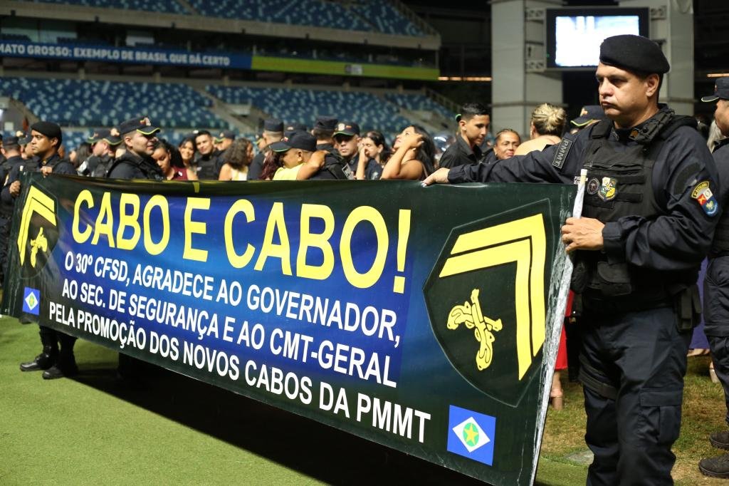 Ao todo, 1.106 soldados da 30ª turma do CFSD foram promovidos ao posto de cabo. A promoção foi possível após medida anunciada pelo governador Mauro Mendes, em outubro deste ano, que destravou um processo que poderia levar até três anos para ser concluído. A iniciativa também recebeu aprovação da Assembleia Legislativa de Mato Grosso.