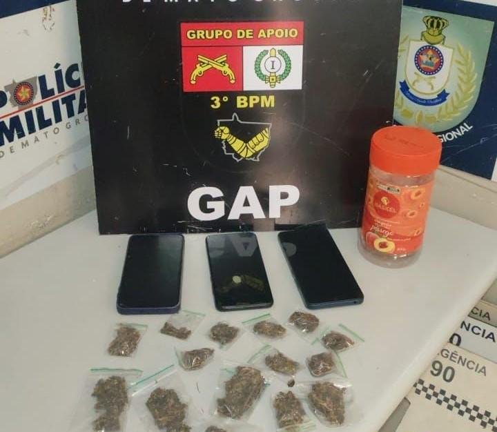 Com o suspeito, foram encontradas duas porções de substância análoga à maconha. Ele informou ainda que mantinha escondido no local um pote contendo outras 16 porções do entorpecente e relatou que residia em um conjunto de kitnets em frente ao ponto da abordagem.