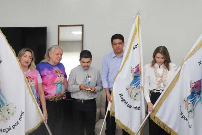 Prefeito e primeira-dama recepcionam passagem da bandeira de Nossa Senhora da Guia no Paço Municipal