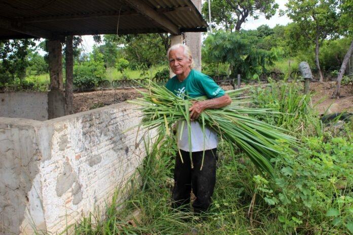 Quem já utiliza essa técnica na comunidade é o aposentado Daniel França, que mora há 3 anos em Formigueiro, onde cria cerca de 20 cabeças de suínos. Ele conta que já fez o curso anteriormente e resolveu fazer novamente para se atualizar. “Todos os cursos que o Senar está fazendo aqui eu estou fazendo esforço de participar. Está sendo excelente porque eu aprendi a criar porco só no caroço de milho e hoje eu tenho uma visão tão diferenciada de tudo isso. A gente hoje faz a capineira, chego de manhã e preparo a comidinha deles com milho, farelo de soja, sal e capiaçu triturado. O básico da alimentação desses animais é o capim porque se eu for comprar só milho e farelo pra eles eu não aguento”, afirma.