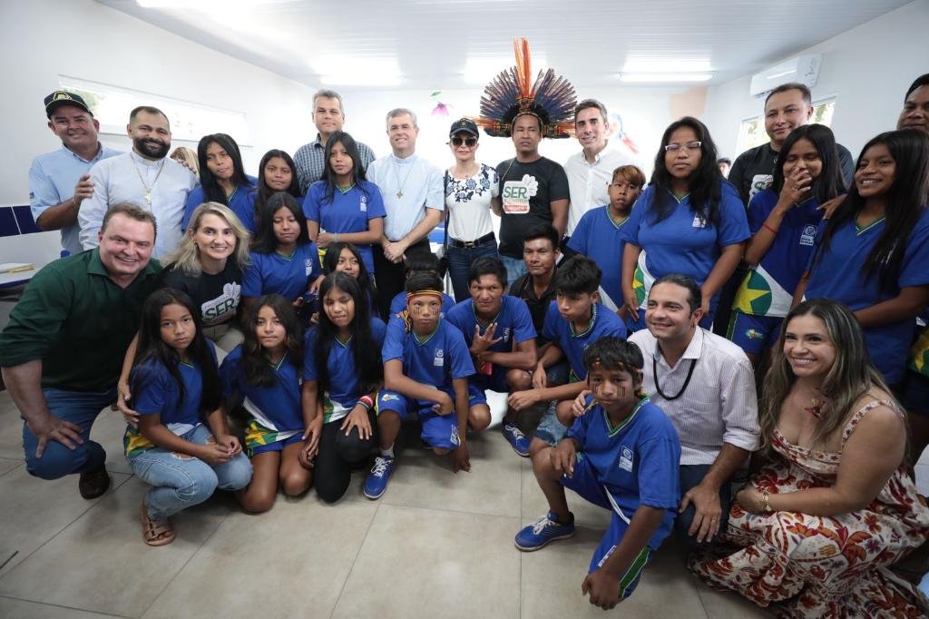 Além da cerimônia de entrega da unidade escolar indígena, a comunidade também recebeu ações do programa SER Família Indígena com as entregas de 200 cestas de alimentos; 200 kits de higiene e limpeza; 200 bolas e 200 kits de doces para as crianças.