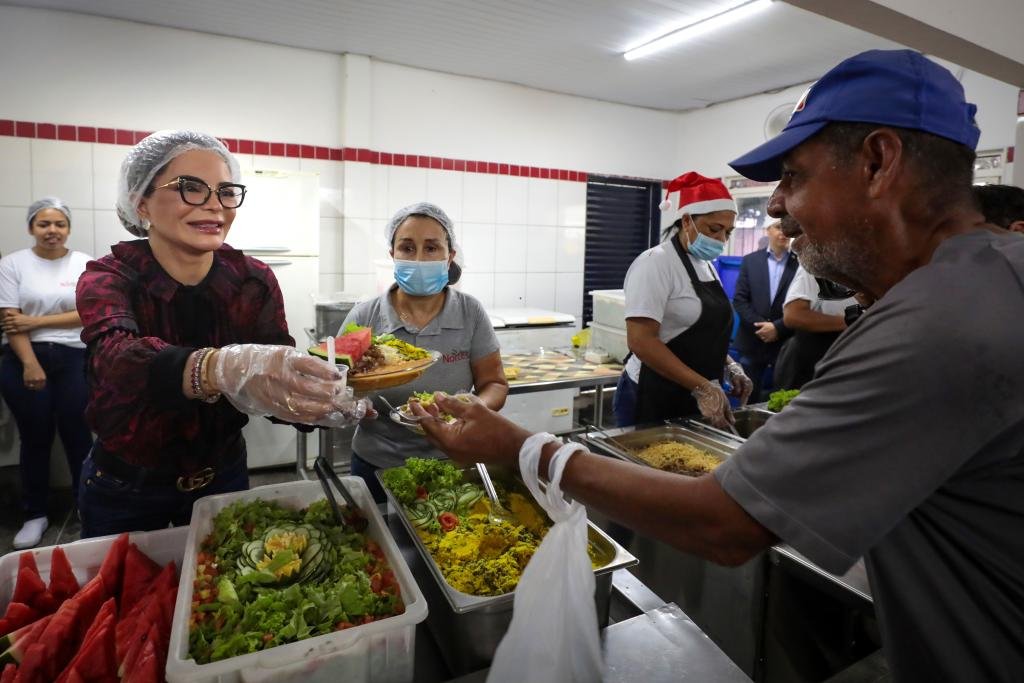 A primeira-dama ressaltou que, mesmo na pandemia da Covid-19, o restaurante não fechou as portas, garantindo que as pessoas em situação de rua recebessem as marmitas com as refeições.