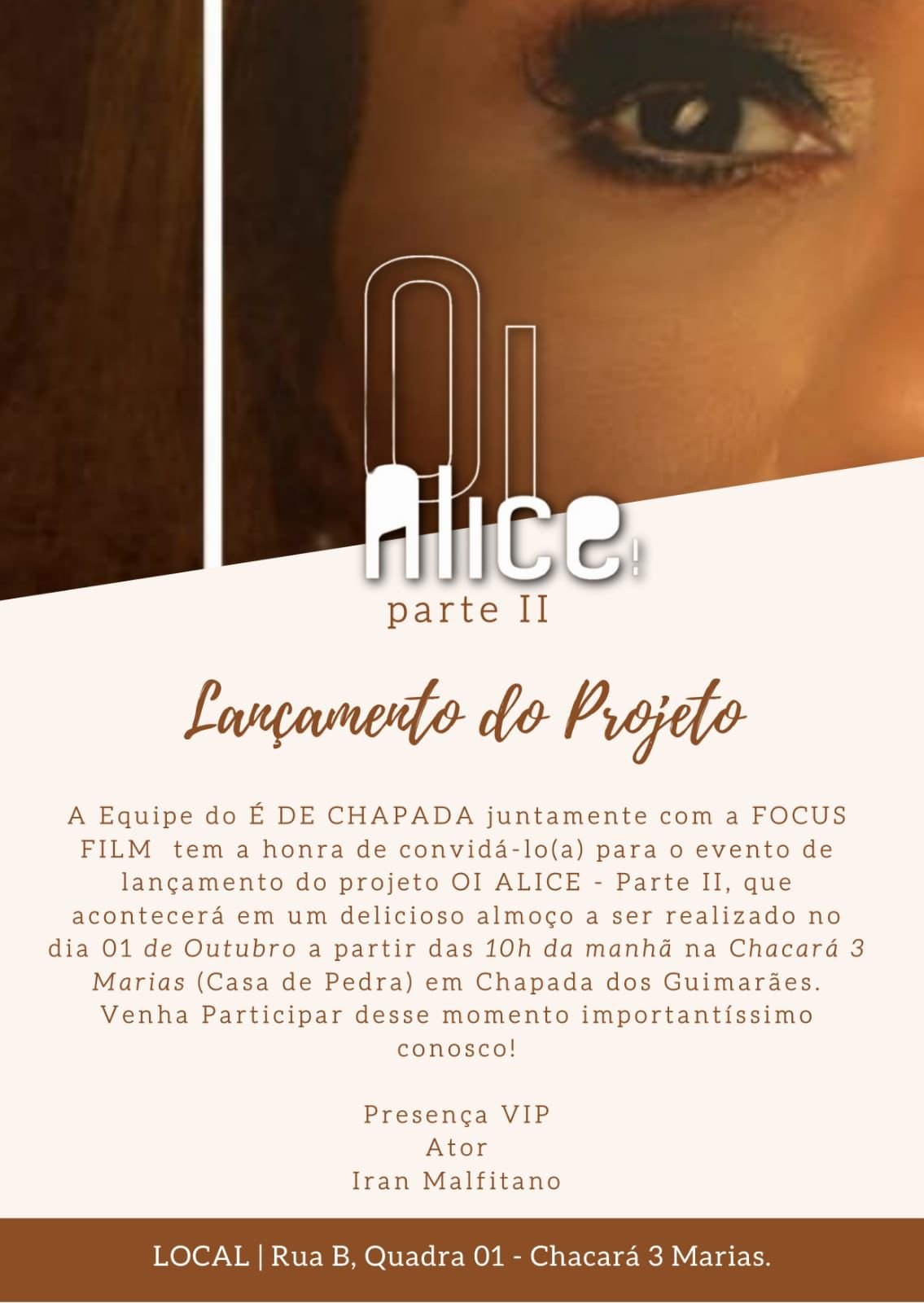 É com muita alegria que o projeto empreendedor É DE CHAPADA e a FOCUS FILM realizam na próxima sexta-feira (01.10) o pré-lançamento do filme OI ALICE – Parte II. Na oportunidade, será lançada ainda a cerveja exclusiva feita por mulheres Quilombolas de Chapada dos Guimarães, em parceria com a Cervejaria Xaraés. Você é minha (meu) convidado (a) especial para o lançamento, com a presença Vip do ator Iran Malfitano, apresentação de Siriri e Danças Quilombolas.