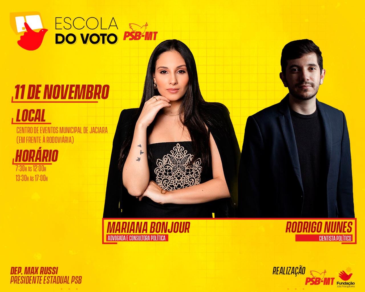 Com foco no aprimoramento político, o presidente do Partido Socialista Brasileiro de Mato Grosso (PSB/MT), deputado estadual Max Russi, promoverá, por meio da fundação João Mangabeira, no sábado (11), em Jaciara, o curso “Escola do Voto”. O curso será ministrado pela advogada e consultora de marketing político, Mariana Bonjour, e pelo cientista político Rodrigo Nunes.