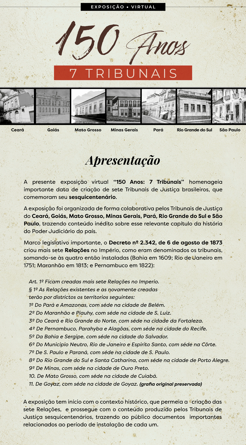 Os Tribunais de Justiça do Ceará, Goiás, Mato Grosso, Minas Gerais, Pará, Rio Grande do Sul e São Paulo lançam, nesta segunda-feira (7), a exposição virtual “150 anos – 7 Tribunais”, que celebra o aniversário do Decreto nº 2.342, de 6 de agosto de 1873, assinado por Dom Pedro II. O documento criou as novas Cortes que se somaram as quatro já existentes (Bahia, Rio de Janeiro, Maranhão e Pernambuco) e que correspondiam à 2ª Instância. O objetivo era aproximar a Justiça brasileira da população “para comodidade dos povos”, conforme previa a Constituição Imperial de 1824.