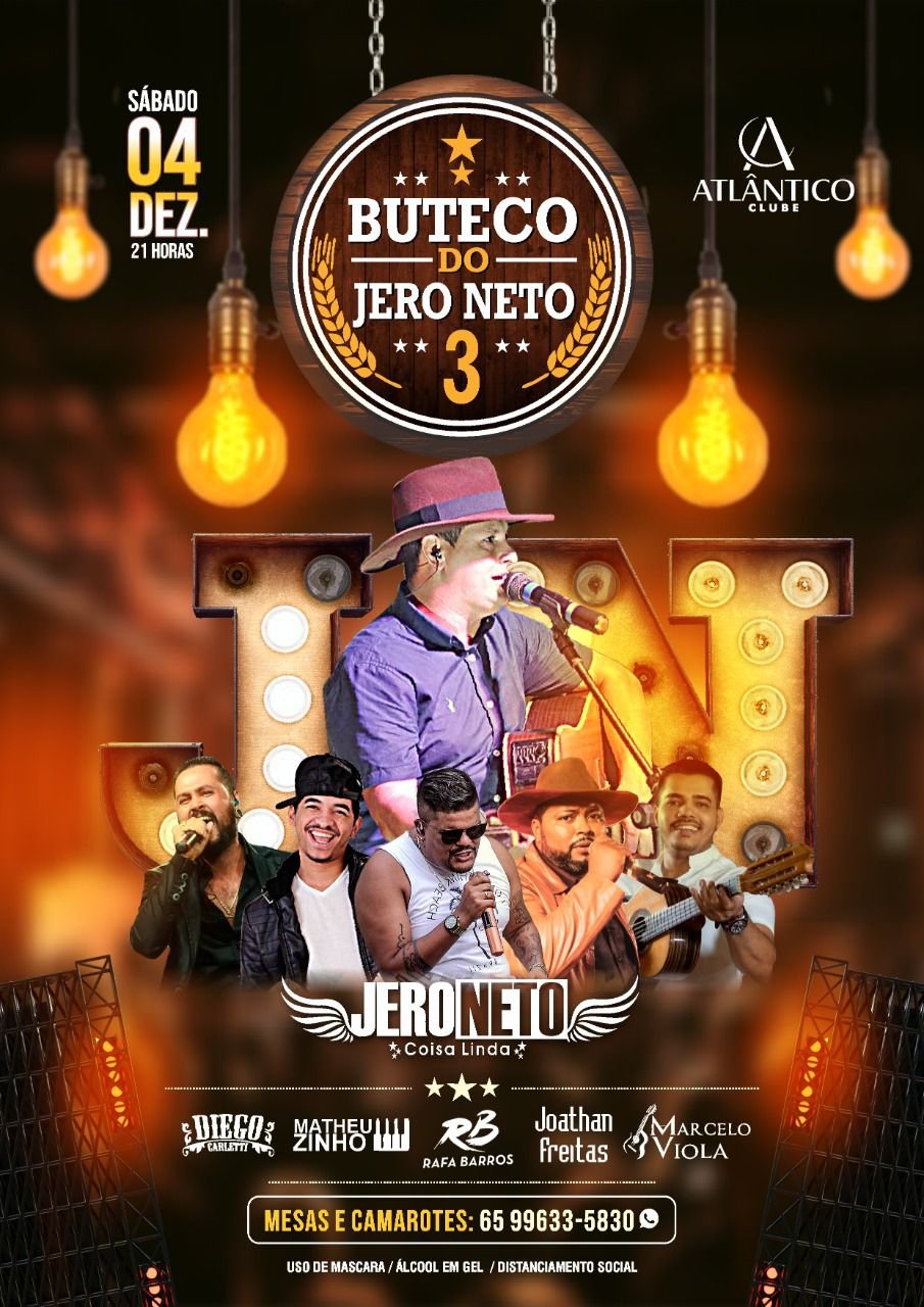 O cantor e vereador Jero Neto realiza a 3ª edição da festa que leva seu nome, o Buteco do Jero Neto. O super show será realizado no dia 04 de dezembro, às 21h, no Atlântico Clube.