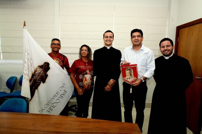 Como parte do cronograma, nesta terça-feira (17), os padres Helder Zolet (pároco) e Diogo Monteiro (vigário) e os festeiros Fábio Minas Novas e Eliane Nunes (rei e rainha) levaram a bandeira do santo até o gabinete do prefeito Kalil Baracat. “É uma tradição. A gente fala que é a visita de São Sebastião ao prefeito da cidade porque São Sebastião é co-padroeiro da cidade”, explica o padre Diogo Monteiro.
